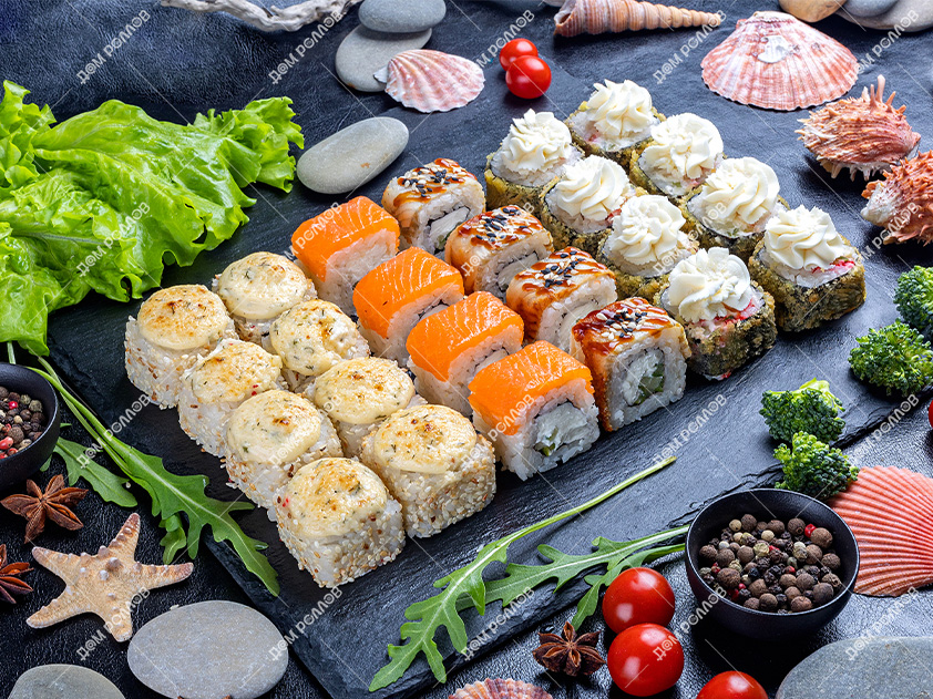 Ролл Инь Янь. Запечённый ролл Филадельфия. Жареный ролл Йоко. Специи: имбирь 1 шт, соевый 1 шт, васаби 1 шт, палочки 1 пара